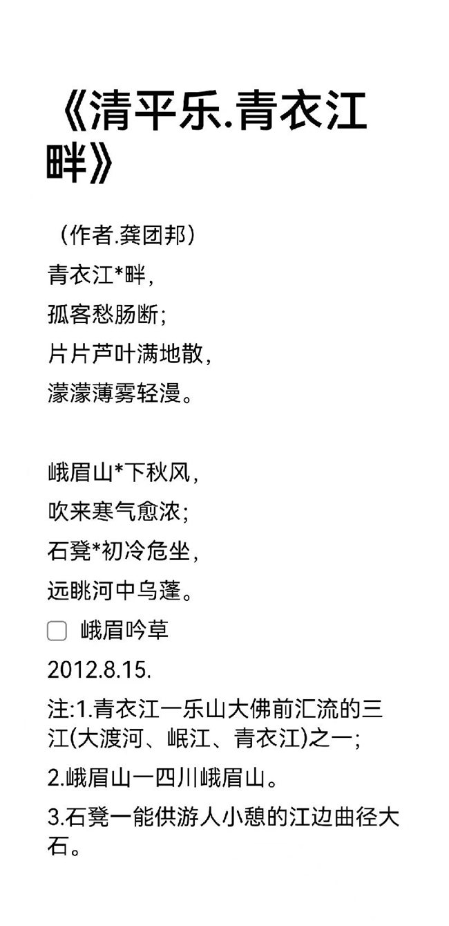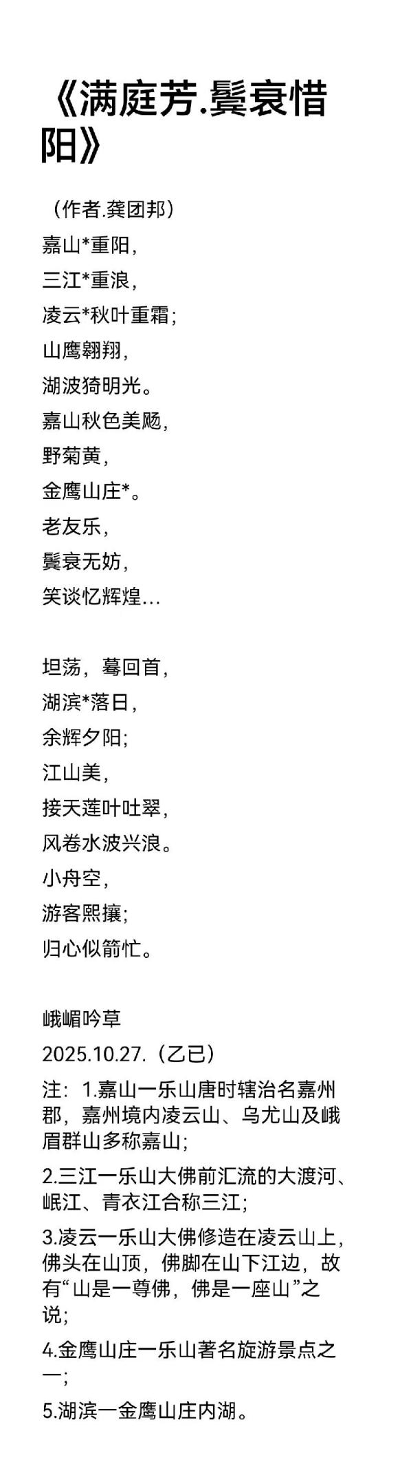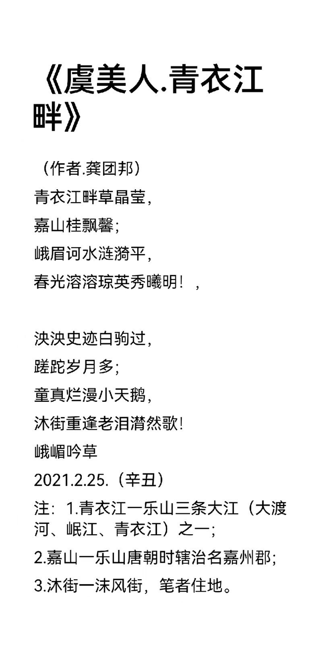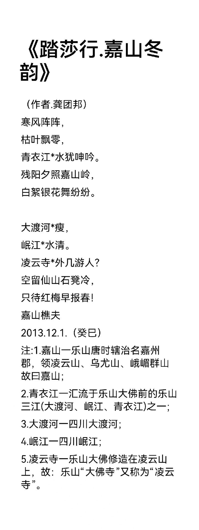 龚团邦,男,汉族,字楊铭,号《嘉玉阁》主人,中共党员,大专文化;1952年出生于四川省乐山县沙湾区老鸦乡,启蒙于乐山沙湾(郭沫若)故乡的沙湾小学,受郭老影响较大,爱好文学和古典诗词的学习与创作。笔名汉邦、江岩、怪老头、峨嵋吟草、乐山乐水、嘉山樵夫、凌云居士。