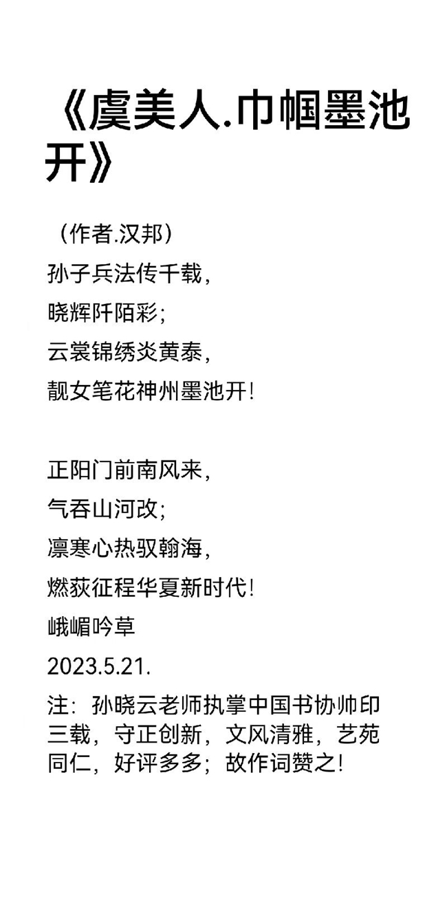 2023年:原创诗词《虞美人·嘉色秋色》《鹧鸪天·除夕》荣登百强艺术家榜单;原创诗词作品《醉花阴·峨眉白雪娇》《虞美人·嘉山秋色》《踏莎行·嘉山冬韵》入编《中国艺术传承大师》;诗词作品《虞美人·嘉山秋色》《青玉案·沫水吟(立秋)》《鹧鸪天·蜡炬泪母子情》入选《近现代中国书画名家辞典》(中国文化出版社);作品入编《中国美术精品集》再获“德艺双馨艺术家”称号。