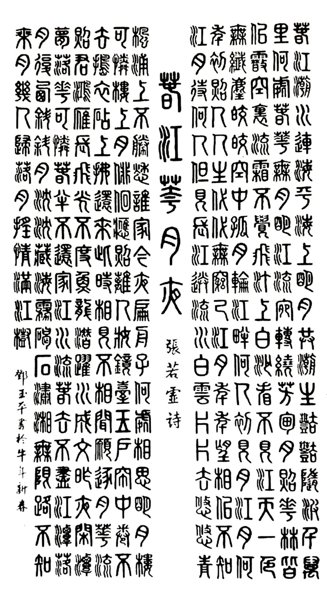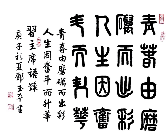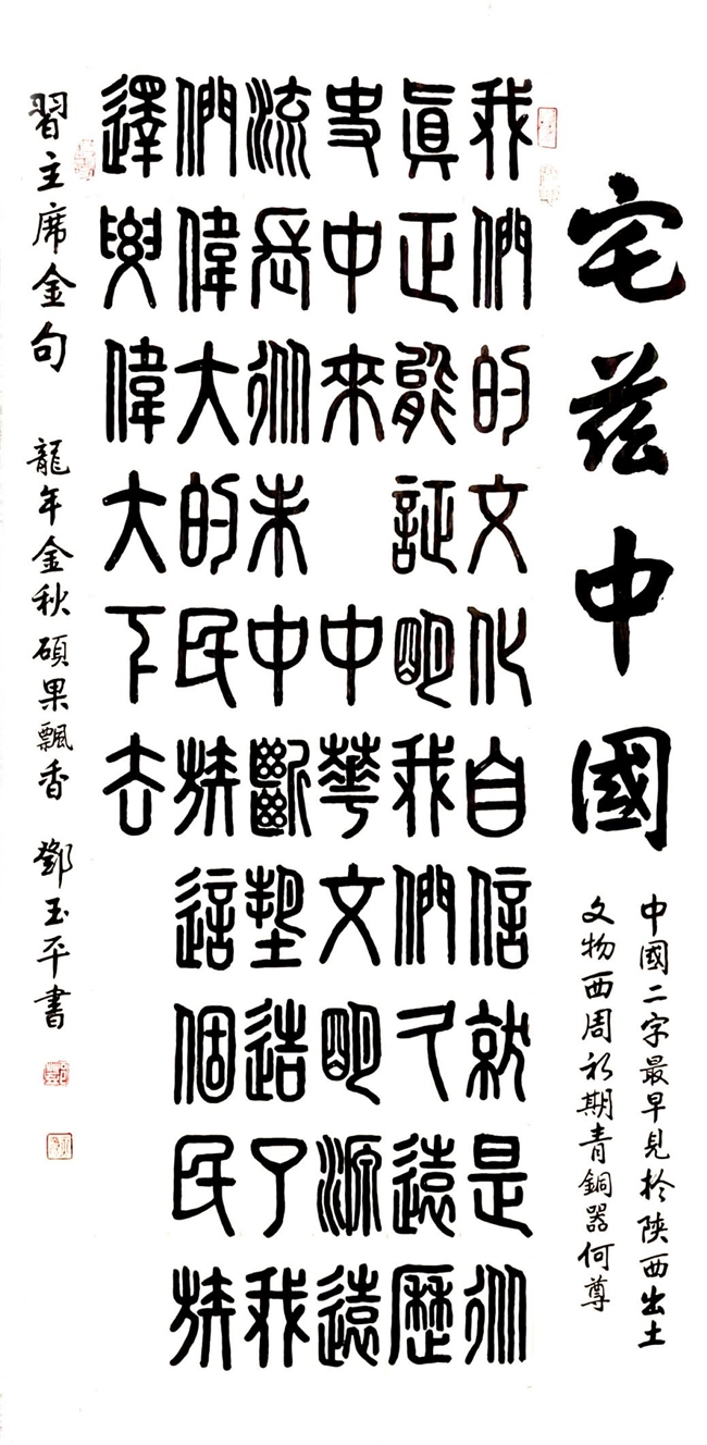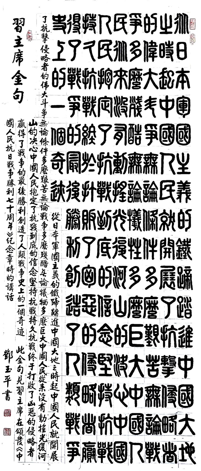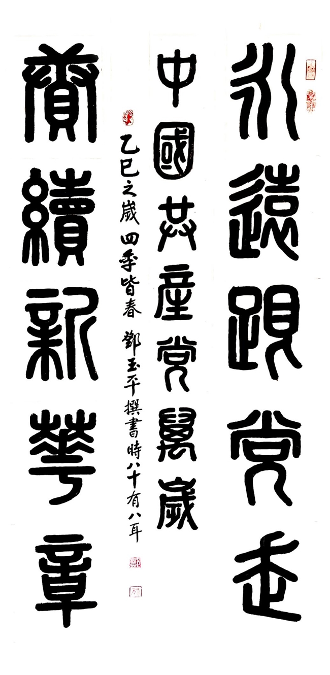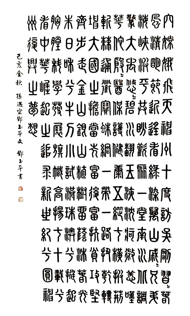 邓玉平,中共党员,1937年出生于湖南双峰书香门第。9岁开始临帖,父辈的严格要求,家庭文化环境的熏陶,使他对祖国传统文化有了浓厚兴趣和执着追求。多年来获奖无数。《中华瑰宝》编委会和中书研相关领导题写的长篇评论《洞庭风骨湘水才情——艺坛巨匠邓玉平》和史峰先生的专评《尚古求法琢秦汉,法度严谨书真法——记著名书法家邓玉平》全面深刻,很有代表性。2019年庆祝新中国成立70周年,世界华人楷模协会评定袁隆平,郎平,邓玉平,任正非,叶嘉莹,丘成桐六位为华人楷模,颁发荣誉证书,编印《华人楷模·引领世界》专集。中意建交五十周年组委会特授予杨振宁、柳传志、邓玉平、袁隆平为形象大使(中方)。2020年,他的作品入编《献礼故宫建成六百周年当代书法十大名人特刊》,组委会授予他“中国文化·百年巨匠”荣誉称号。