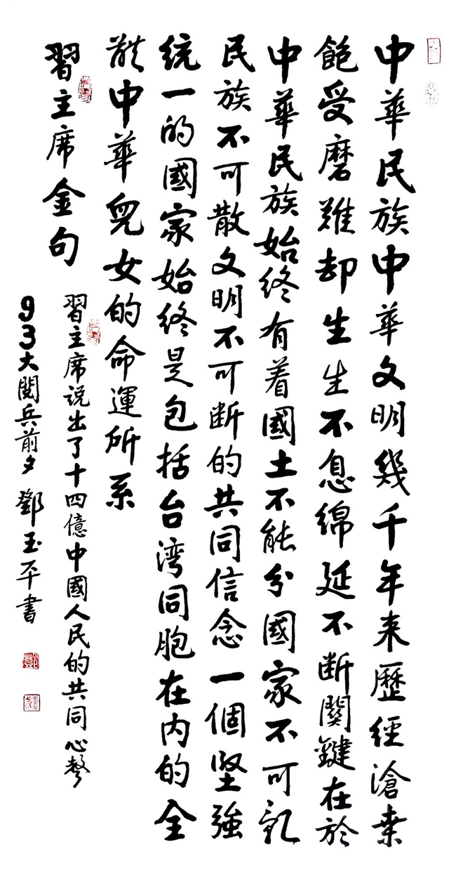 欧阳中石老先生点评:邓玉平先生根植基层,先前早已熟知。先生其书法作品,用笔巧妙,聚灵动与和谐于一体,体现了“大秀、大雅、大气、大美”之风,线条流畅纵情,具有极高的审美价值,颇为当代大家。挥笔大方,可谓上乘之作。其艺术造诣,不仅汲取了传统理论和实践精华,更自创出属于自己的风格,无愧于国礼艺术家!