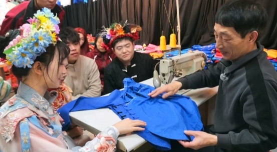 访谈间隙,黄晨老师起身走到墙边,取下两件不同的上衣向队员们展示:一件是传统的深蓝色大裾衫,棉质厚实、纽扣扎实;另一件则是为了迎合游客拍照需求而制的亮色机绣服饰,绣工精美却质地轻薄,虽然好看却不耐磨。
