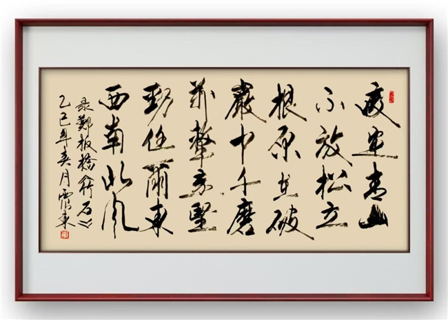 韦震东先生书法字体遒美健秀,心慕行随。朝临池而不辍,暮笔耕而不息,广纳前贤,有汲名家,自身书功终成高意!四十多年来临池不辍,得到书法界名人的悉心指导,在创作上唯有与先贤同源,与心神相会,所创作作品达于翰墨正道!书法才有着飞跃性的进步。笔法是唯尚于跌宕端庄,意在具便而不失法,具格而不唐突。笔致行运,时而参差于遒健,时而顿挫于纵横,加之墨韵飞白,整幅作品即更是显于虚实动静之变。形成自己笔力雄厚、苍劲有力、大气磅礴、粗细结合、飘逸酒脱的个人独特风格。