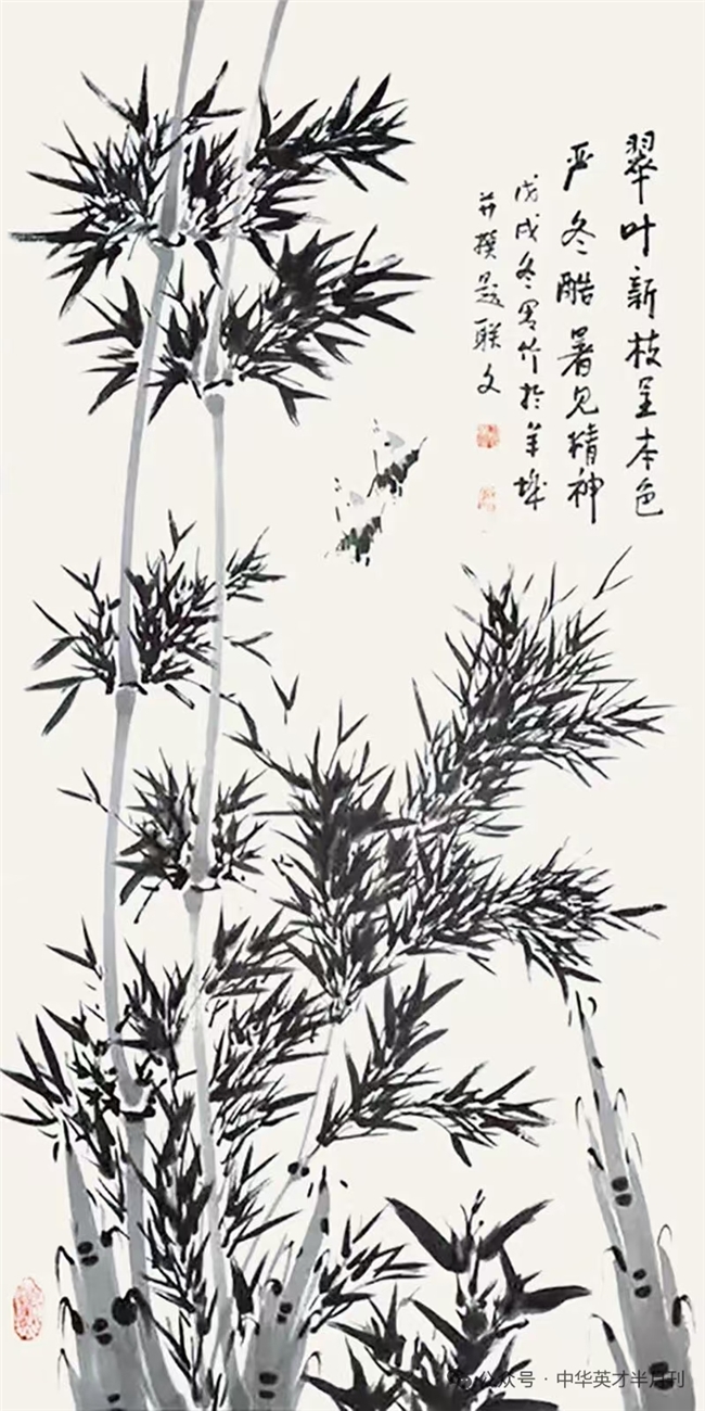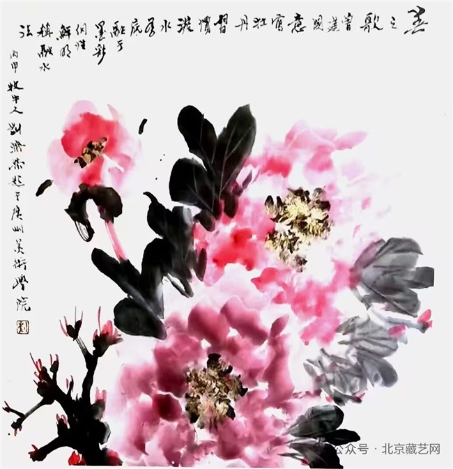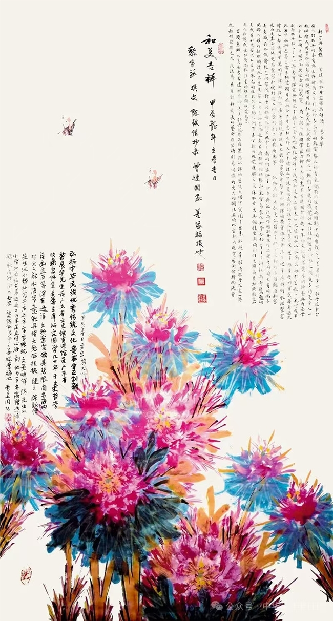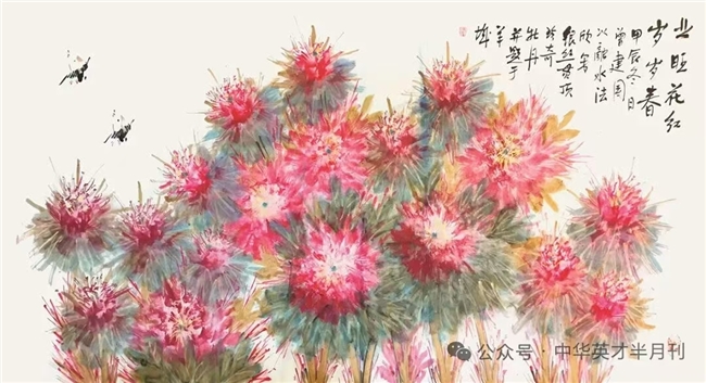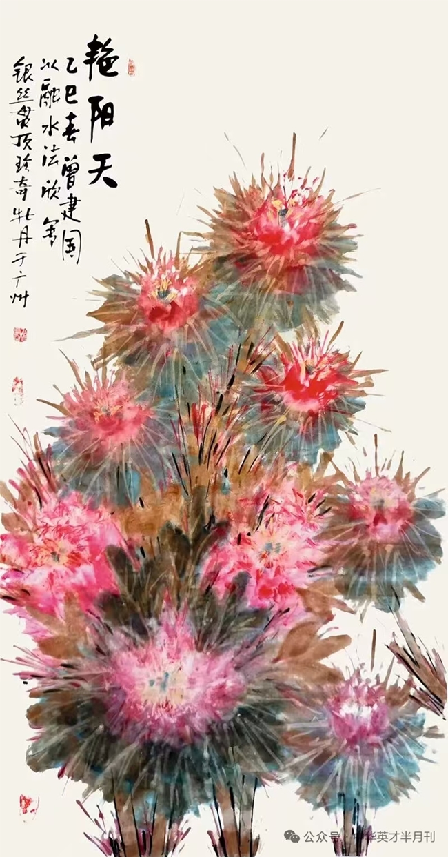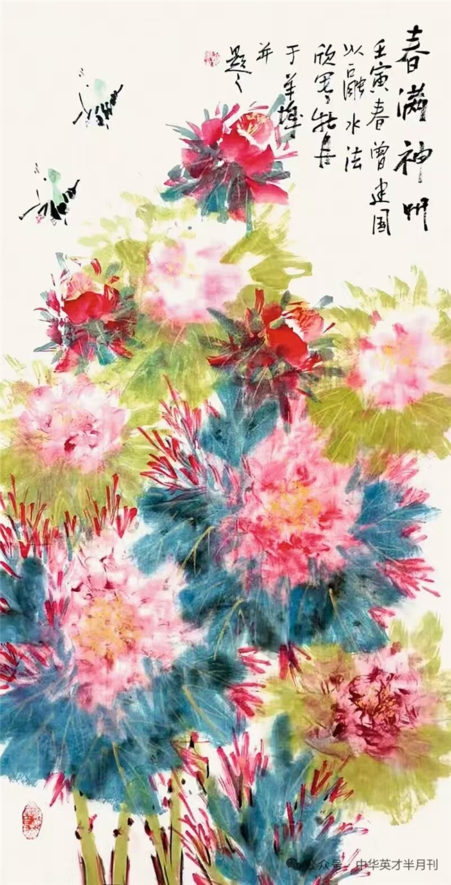 带着徐渭的奔放,参意八大的孤高,曾建国的牡丹更显博大与昂扬,常以“盛放与待放”并置的构图隐喻发展的生机,实现了传统抒情性向时代宏大叙事的转化。劲健如风的画笔里,也有细腻如诗的内涵脉络。这是因为曾建国的牡丹创新根植于深厚的传统修养的同时,是带着书画同源的魅力进行物象塑造的,时时将书法用笔的节奏与诗词楹联的格律感内化于绘画,笔法转换合乎书法精髓,题跋内容与画面意境相生,成为诗书画一体呈现的高端作品。在这些作品里,“融水法”不可复制的技法精髓已成为当代中国画研究与实践的学术贡献,既有深厚的文化承载力,又是公共空间巡展的首选作品,作品在北京地铁、巴黎奥运会艺术活动等空间与国际文化盛事中,都有着广泛的传播力。