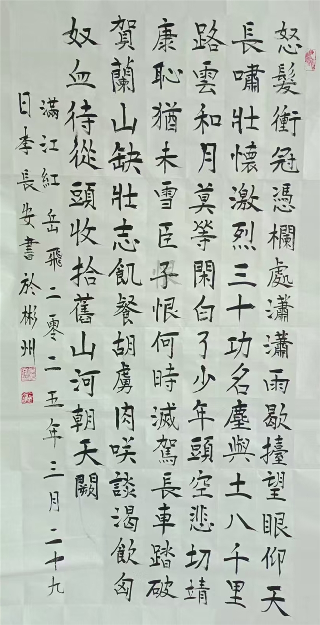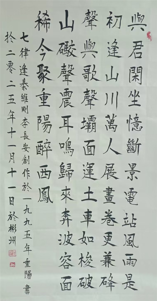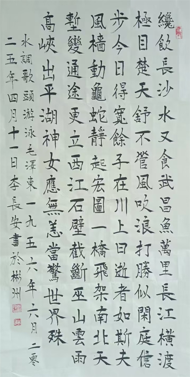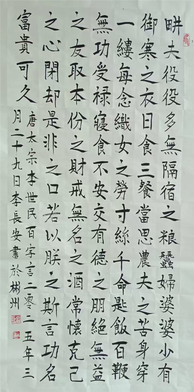 李长安,男,生于1950年,住陕西省咸阳市彬州市太峪镇街道。在大集体時期,在几个大工程上,如水电站、梅七线、治理太峪河,先后曾任公社連部、营部、治河指挥部技术員兼保管員,84年后,曾任彬县个体协会太峪分会主席,主任,会长30余年。并兼任彬县工商联合会太峪分会主席,主任,会长30余年。86年曾出席陕西省召开的私营企业,先进个体劳动者表彰大会,会后省委书记張勃兴和代表们一起合影留念。现在是彬州市书画协会会员,咸阳市老年诗词书画协会会员,陕西省老年诗词书画协会会员,中华人民共和国一级书法师,国粹艺术名家,走向世界国礼艺术家,文化强国2025书画百强艺术家,CCTV签约艺术家。