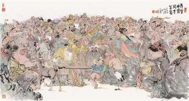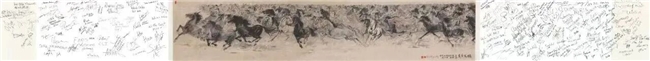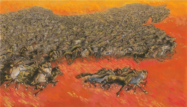 因为父辈曾是参加过抗日战争和解放战争的军人,所以于信强自幼年起就对军人有一种特别的情愫,也是日后创作红色系列作品的原动力之一。《红色地平线》画卷是于信强历时三年时间,为庆祝中国共产党百年华诞创作的系列作品之中规模最宏大、篇幅最长、人物最众多的一幅红色历史作品。此作品取材于 1934年10月至1935年10月间,在中国共产党领导下的中国工农红军,为粉碎国民党反动派第五次「围剿」而踏上战略转移的征途,这也是世界战争史上最著名的一次远征。历时一年多,纵横十几个省,行程二万五千里,打破数十万敌军的围追堵截,战胜无数艰难险阻在甘肃会宁胜利会师的生动场面。画卷以毛泽东、周恩来、朱德等领导人为首的三百多位红军战士一字排开,构思取意于远古伏羲一划开天,而今中国共产党经过艰苦卓绝的奋斗,为新中国开天辟地,如地平线上冉冉升起的朝阳,给黑暗中的中国人民和劳苦大众带来了光明,同时也寓意着中华民族崭新的开始。画中每个人物皆有创作原型。于信强为搜集红军将领们的英雄事迹和形象,用了一年多的时间查阅史料、实地寻访,与红军的后人交流探访。画面以浓墨重彩的表现手法极具震撼力和感染力,突显了历经艰难取得胜利后的喜悦,沧桑的面庞栩栩如生,每个人眼神里都透露出坚定的信念。背景天际的朝霞和红军战士帽子上的五角星及红领章均以朱砂红渲染,交相辉映。画面下方那一双双褴褛的鞋子和夸张手法勾勒的腿脚,彰显了中国工农红军具有战胜任何困难的毅力和无比坚强的生命力,也正是这一双双腿脚走出了今天的新中国。这一历史壮举于今日之我们,其寓意深远。