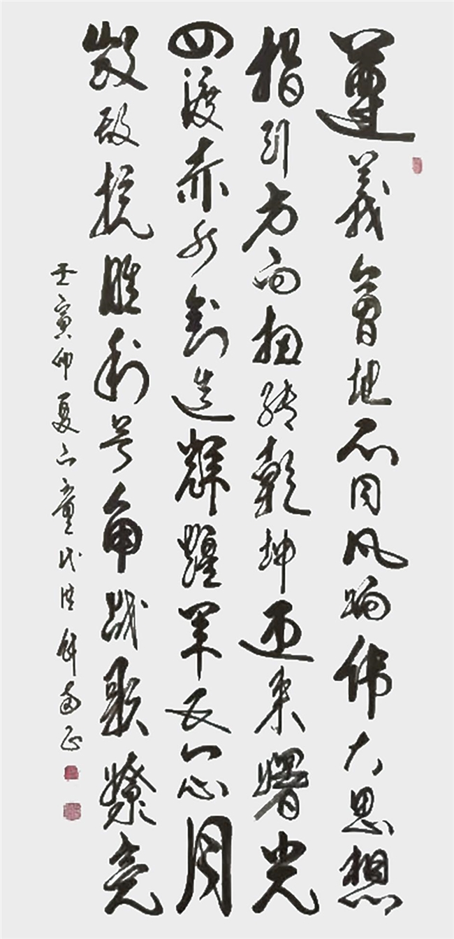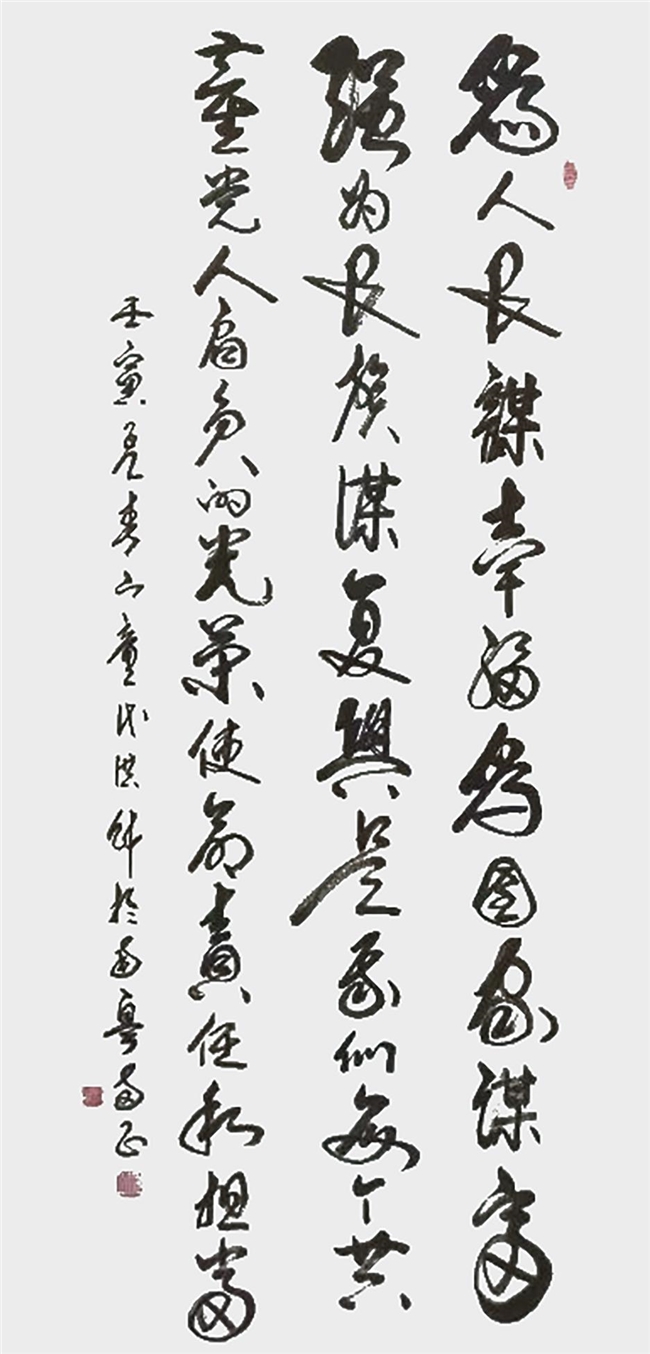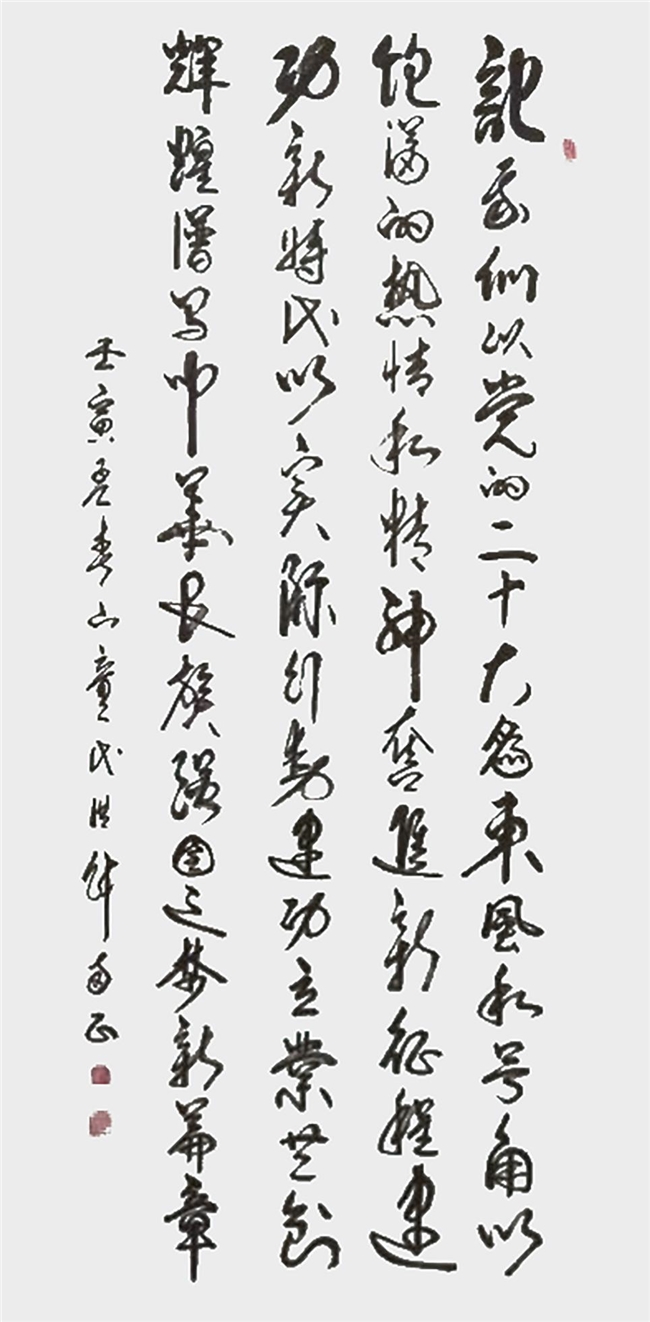 代洪财先生的书法笔墨中蕴藏着浓厚的革命精神‌,以风骨续写红色基因,每一笔都是信仰的刻痕。他以宣纸为战场,毛笔作刀枪,他的字里行间奔涌着《东方红》的磅礴气韵,将革命者的豪情凝成永恒。代洪财先生的书法艺术,堪称家国情怀的笔墨丰碑,作品以雄浑遒劲的笔法承载着中华文脉,从《开国大典》到《强国之梦》,他的书法是穿越时空的红色信笺,记录华夏从站起来到强起来的壮阔诗行。书法是艺术与信仰的融合‌,若将艺术比作革命号角,代洪财先生的书法便是新时代的回响:既有金戈铁马的铿锵,更见盛世山河的辉煌。不囿于形,而忠于魂!他的字如红旗舒展,在传统笔墨中舞出共产主义者的赤诚与坦荡。