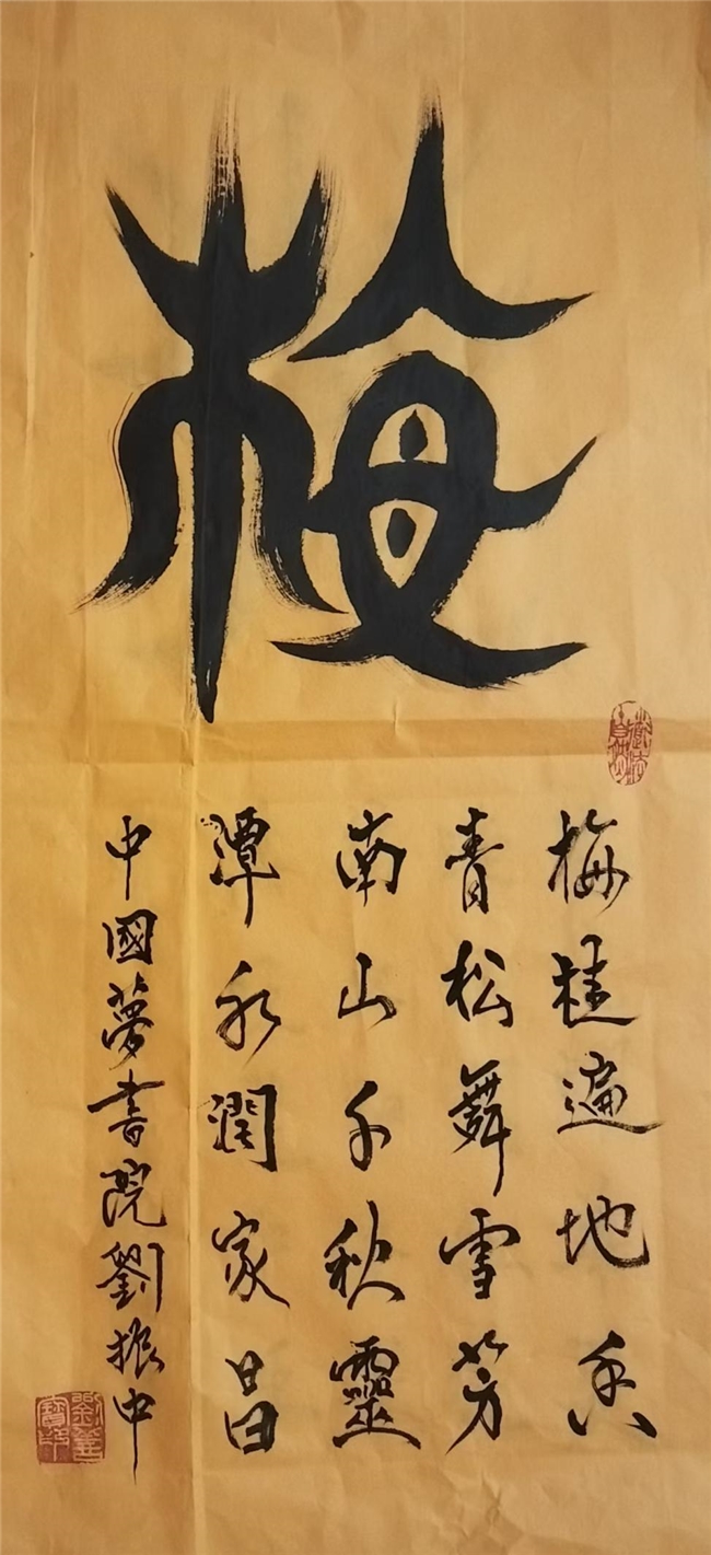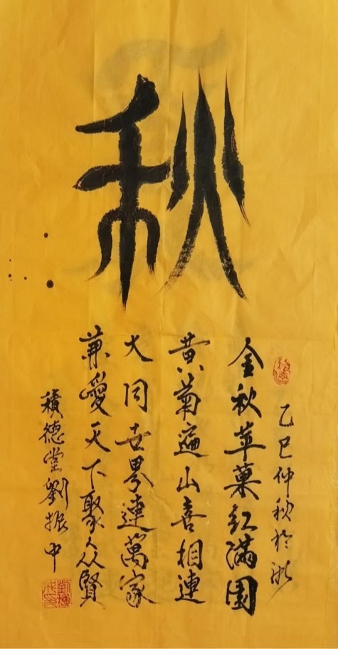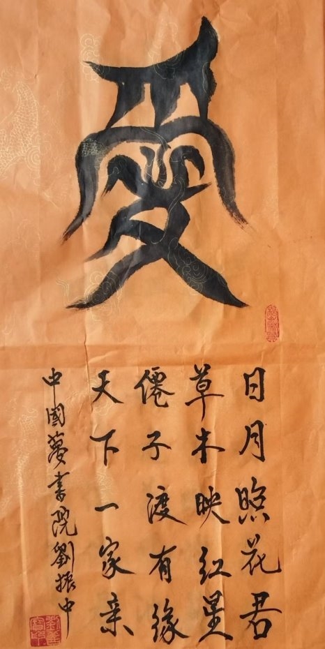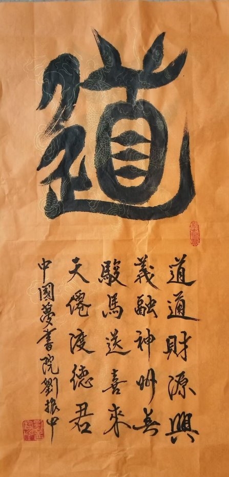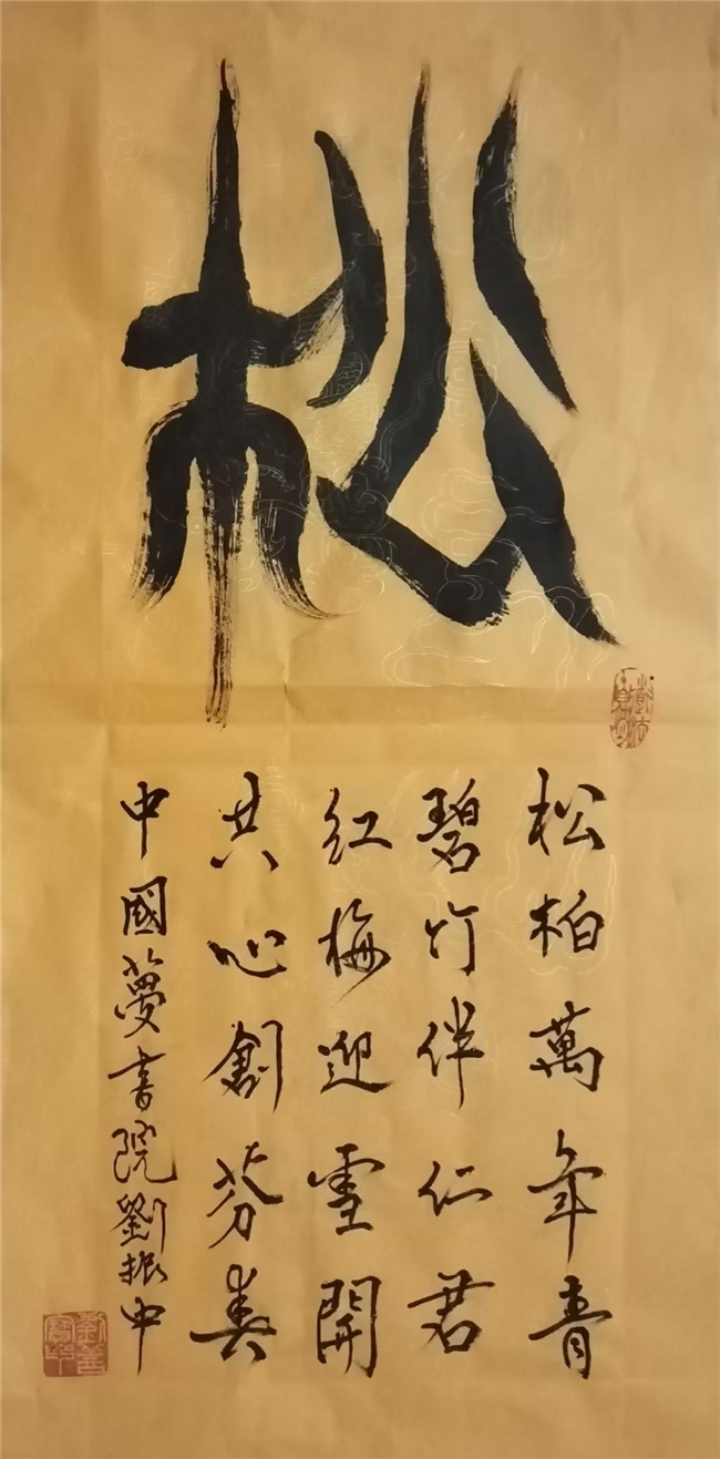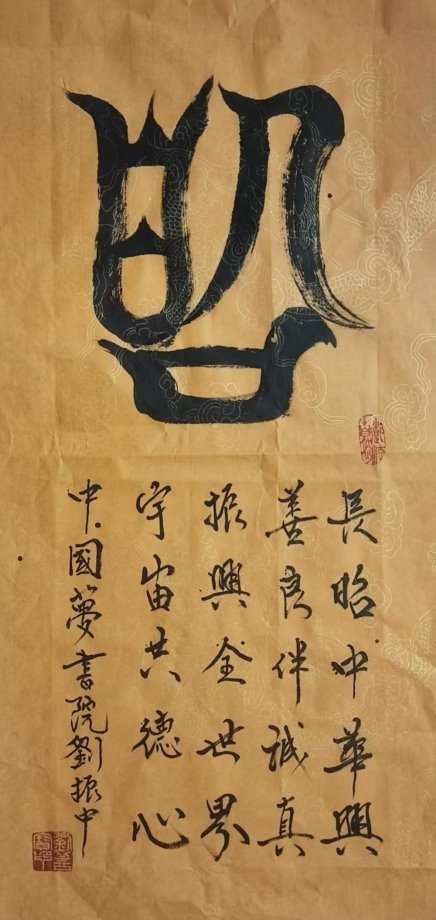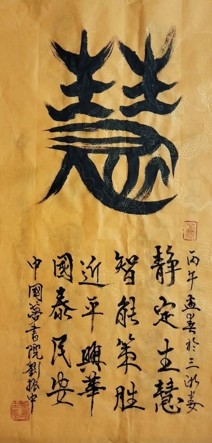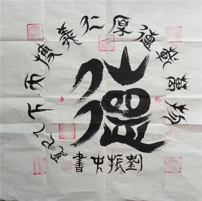 刘振中深谙书画艺术的奥妙,他将古代甲骨文与现代书法艺术相结合,创造出独特的艺术字体。他从中感悟到古代创造文字的灵性,将中国 文字进一步美化、形象化,并巧妙地将其发扬光大。他的书法作品在全国书画评选中屡获殊荣,包括 2018 年纪念毛泽东诞生 124 周年书 画展的金奖。