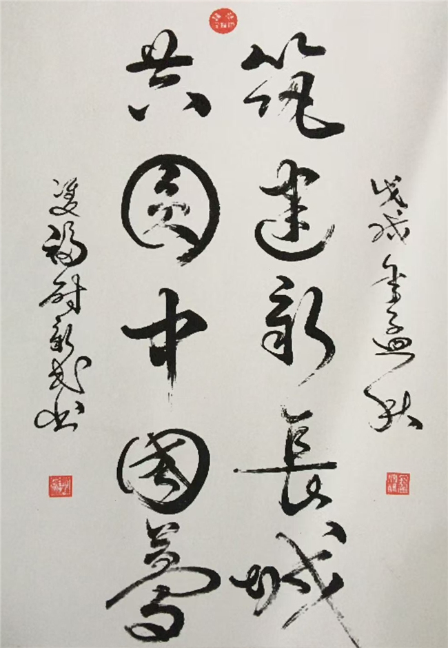 他的草书作品更是将这种艺术感染力推向极致。2018年全国华人春晚现场,尉新民挥毫书写《保卫黄河》,起运转止丝丝入扣,提按顿挫运转自如,笔墨间既有音乐的旋律感,又有舞蹈的动感美,让现场观众无不震撼。这种对节奏韵律的精准把控,源自他五十余年对书法艺术的执着追求,也让他的作品超越了单纯的视觉呈现,成为可感可悟的艺术盛宴。