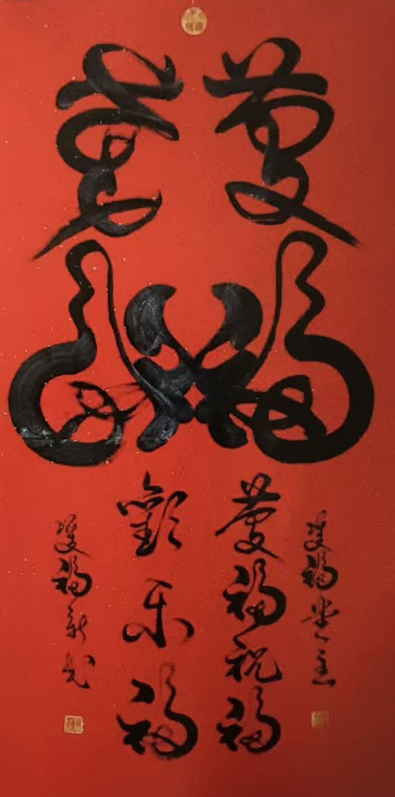 双笔书法的核心魅力,在于“双笔齐书、对称传神”的极致表达。尉新民凭借超凡的手眼协调能力与深厚功底,能同时驾驭两支毛笔,在宣纸上实现同时起笔、同时收笔的精妙操控,其创作的“福禄寿喜财 仁义礼智信”等作品,线条流畅而富有力度,结构严谨却不失灵动,既有楷书的规整稳重,又有草书的狂放激情。他深谙中锋运笔之道,在逆行中锋、标准垂直中锋、顺行中锋间自由切换,辅以捻管旋转的节奏把控,让作品兼具篆隶的骨力与行草的韵味,每一笔划都蕴含生命律动,尽显“雄健优美、节奏韵律”的艺术格调。