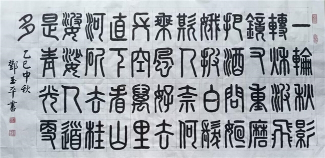 邓玉平,共产党员,1937年出生于湖南省双峰县一书香门第。9岁开始临帖。父辈的严格要求,家庭文化环境的熏陶,使他对祖国源远流长的传统文化有了浓厚兴趣和执着追求。牢记父亲“学成文武才报家国”的嘱托,遵循“堂堂正正做人,规规矩矩写字”的戒律,坚持不懈刻苦努力学习和创作,立志用手中的笔绘时代颂人民,为继承和弘揚祖国的优秀传统文化作贡献。多年来获奖无数。