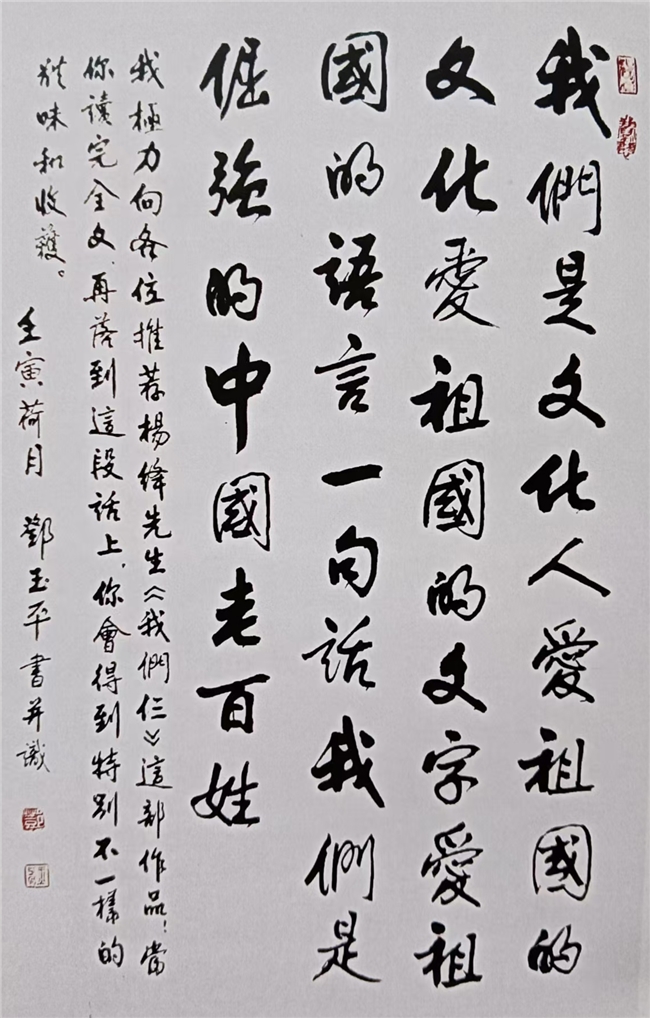 蔡武老先生用“你对书法艺术的执着追求和顽强的拼搏精神,演绎了精彩的艺术人生,在艺术界展现出中国书法人的形象,为世界打开了一扇了解中国文化的窗口”,史峰先生用“临习碑帖一丝不苟,尚古求法一路执着,诸书皆成,博涉多优,所以欣赏他的书法作品,必然会有一种源生的浩然正气从文化龙脉的深处传承而出,令人感到书法的正宗气象”,屈德馨先生用“师古而不囿于古,追古而不逐流,学习传统精华,潜心揣摩领悟,注入自我的审美理想,再加以提炼,使之升华而成的特色独具的技巧,七十年孜孜不倦,终于成就了他的妒火纯青的书法艺术”来评价他的人品和书品。