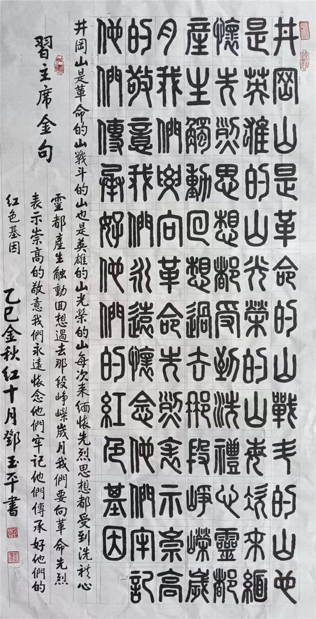 他与袁隆平郎平等六人被评为华人楷模,他与孙晓云张艺谋等十人被授予文化品牌人物,他与钟南山杨利伟等七人被授予新中国社会主义思想*新馬克思主义领军人物;他被一代大家欧阳中石纪念馆推荐为副馆长,他被聘任沈鹏书法艺术工作室专家组高级理事;他荣获中国文化功勋人物勋章,他荣获香港特区政府授予的香港文化紫荆勋章,联合国授予他大国艺术工匠功勋人物勋章,俄罗斯的文化骑士勋章,八一文化勋章,中朝文化友谊勋章……2024年在纪念红军出发九十周年全国书画大赛中,邓玉平先生书法作品从众多作品中脱颖而出获得特等奖,并被中宣部、文旅部及文联联合授予:“共和国红色文化楷模”荣誉称号。