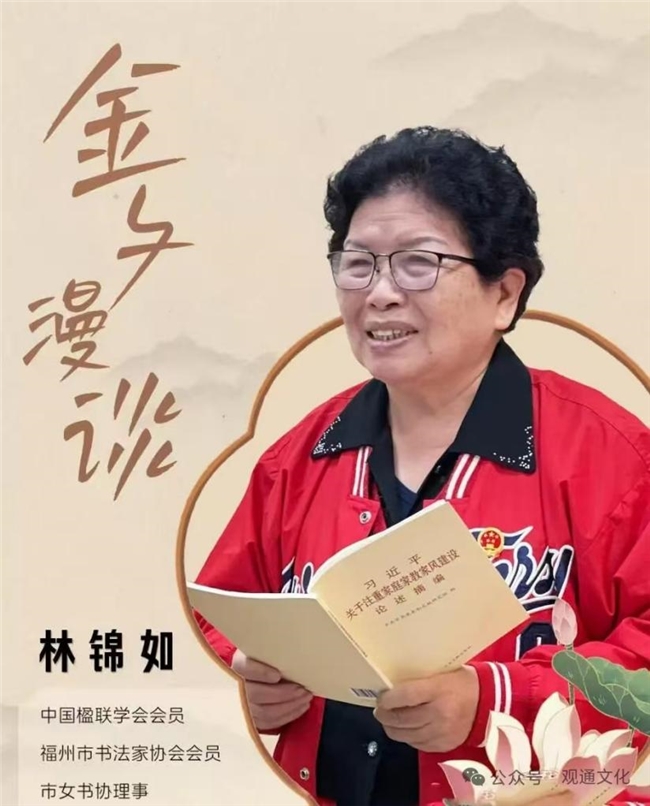 林锦如,中共党员。中国楹联学会会员,师从清华大学美术学院夏鹏程教授,福建省楹联学会会员、书艺委委员;福建省正能量文化促进会副秘书长;福州市书法家协会会员,福州市女书法家协会理事;福州市鳌峰画院顾问;奥杯赛书画院闽江分院院长,送福大使;CV助力官艺术顾问;福州市鼓楼区、台江区、晋安区业余讲师团成员,(台江区讲师团副团长);福州市岳峰镇桂溪锦如党建工作室带头人;福州市晋安区教育关工委常务副主任。