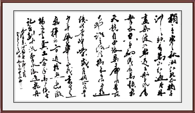 飞白之书为书圣王羲之所创,确切地说王羲之是集大成者,因为他的飞白之书既非空前,亦非绝后。姜国亮先生在其草书"龙"字中飞白运用可谓达到了随心所欲而又不逾矩的地步,笔墨神来,龙吟墨海,昂首奔腾的神奇形象令观赏者为之品味。观者与书者的思绪共振是书法艺术的魅力所在,这在姜国亮先生的书法中得到充分的表现。此外,姜国亮先生草书"虎"字,亦是形神兼备之作。其飞白笔法的运用足见其书法已达炉火纯青的高度。"虎"字第二笔的撇,最后一笔的长竖,斑驳之状酷似大写意中国画虎尾的斑驳。姜公此"虎"字结体修长、微曲,更具"猛虎雄踞松峰,啸傲万重青山"之态。字的神韵其实是人的精神及艺术审美观的再现,胸有豪情,笔呈神韵,是书法艺术家终身修炼方成正果的追求境界。姜公的"龙"与"虎"两幅佳作堪称当代书坛珍品。再观姜国亮先生所书《般若波罗蜜多心经》,可见姜公隶书功底之深厚。该作章法如珠玑匀布、格调高古,非具心如止水的定力难以成就。其字体为隶书,用笔方圆兼备,笔画沉实,线条遒劲厚重,多有魏碑笔法显现。粗壮横画中寓有灵动,竖画中也能拙中见巧,由此形成了自己的书法特色。同时姜国亮先生的书法碑帖融合,入古出新。其用笔苍劲老辣,线条独特,书法雄强奔放,章法自然(见本文附图的教员《沁园春.长沙》及李白《早发白帝城》)。特别在草书的创作上极尽变化,并随着书写内容,进入笔墨神驰,一任自然,具有极强的视觉冲击力,从变化的线条及节奏中给人以共鸣,形成了鲜明的独家书风。