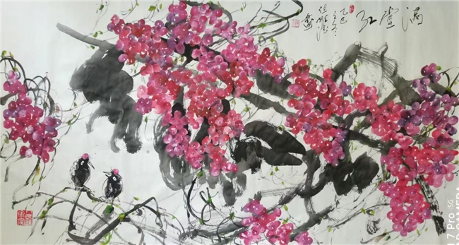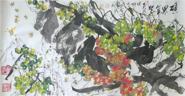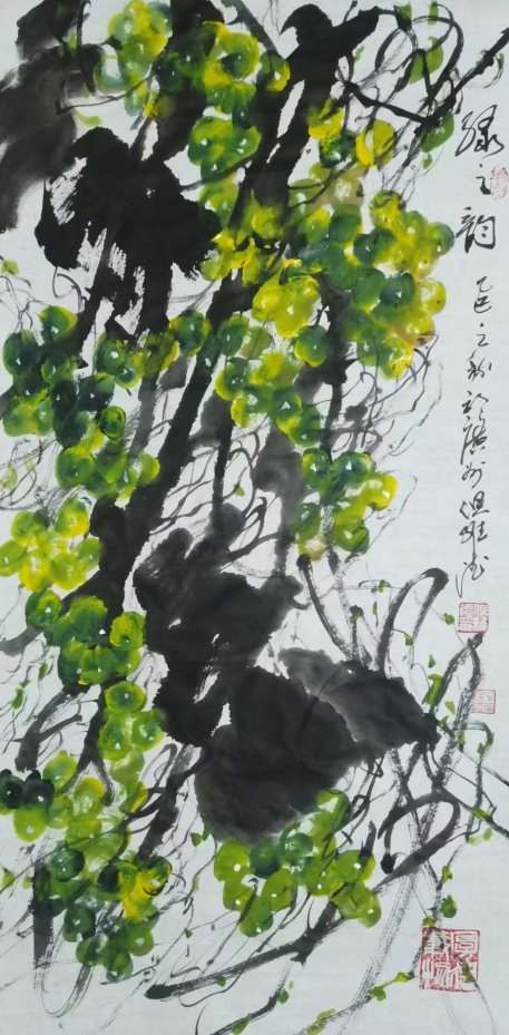 而老师的书法作品,更是令人拍案叫绝。每一笔一划,都力透纸背,彰显出老师深厚的书法造诣。他的字体,既承袭古风,又独具个性,既古朴凝重,又灵动洒脱。在老师的笔下,每一个字都仿佛被赋予了生命,它们或跳跃、或沉静,共同演绎着一场视觉与心灵的盛宴。此外,但维德老师的果木画作也同样令人赞叹。他笔下绘出的葡萄栩栩如生,仿佛能够闻到果香,感受到生命的脉动。但老师在描绘这些果木时,不仅注重形态的逼真,更注重神韵的传达,使得每一幅作品都充满了生机与活力。