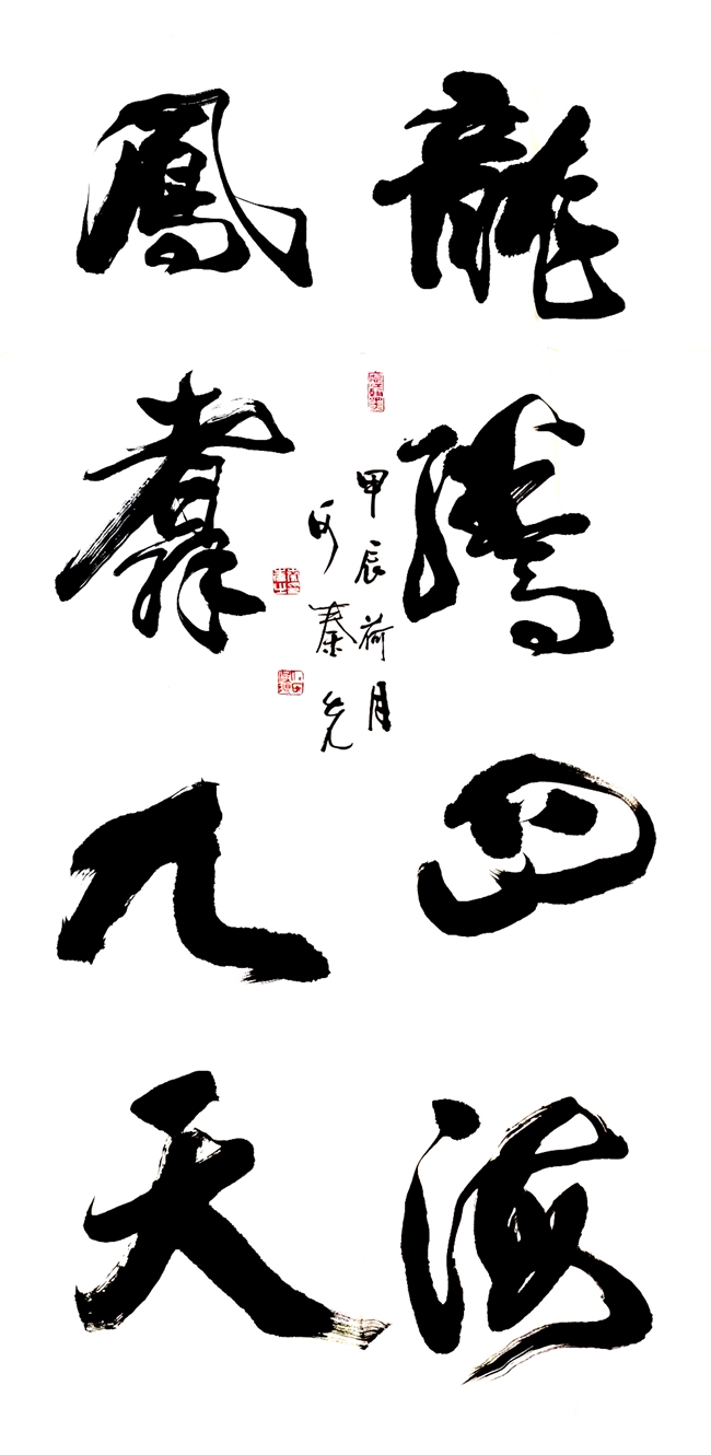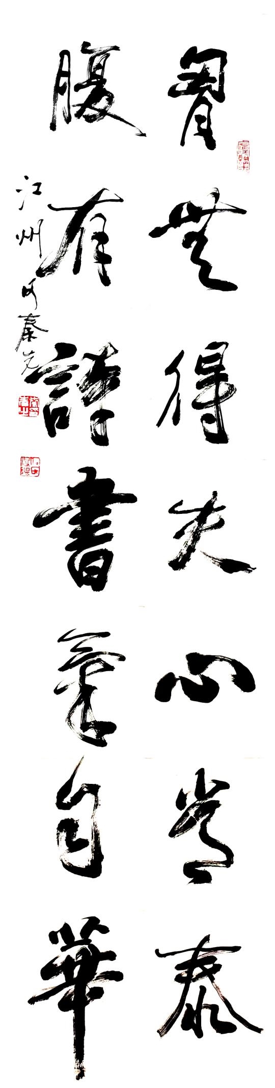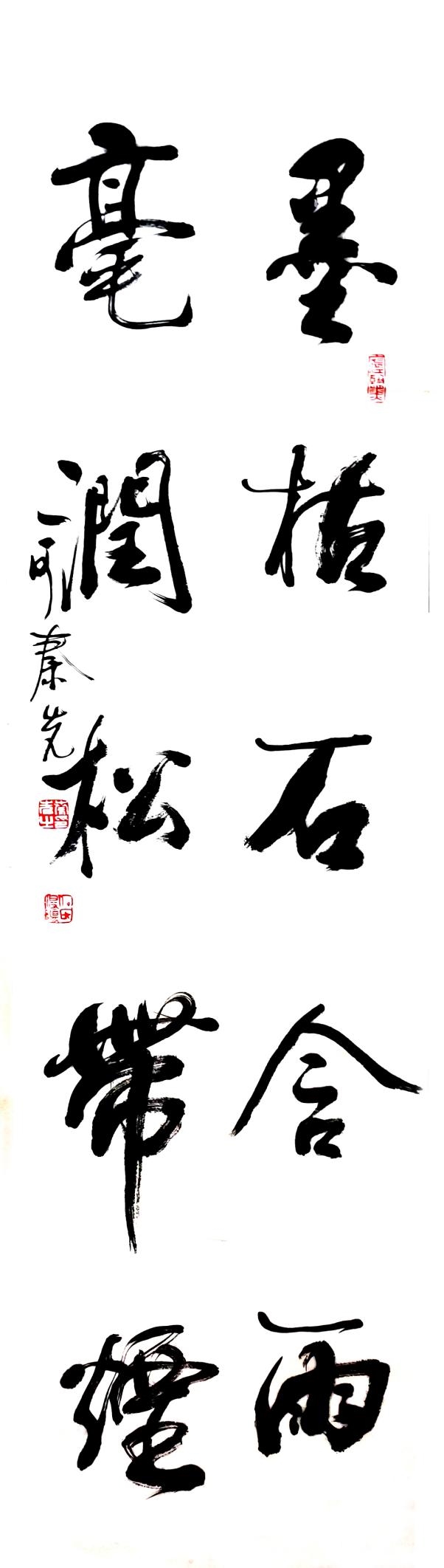 曾临习过一些金文、碑文和历代名家名帖,尤善行、草及榜书。创作时注重线条的空间造型,将雄强与柔美有机融合。