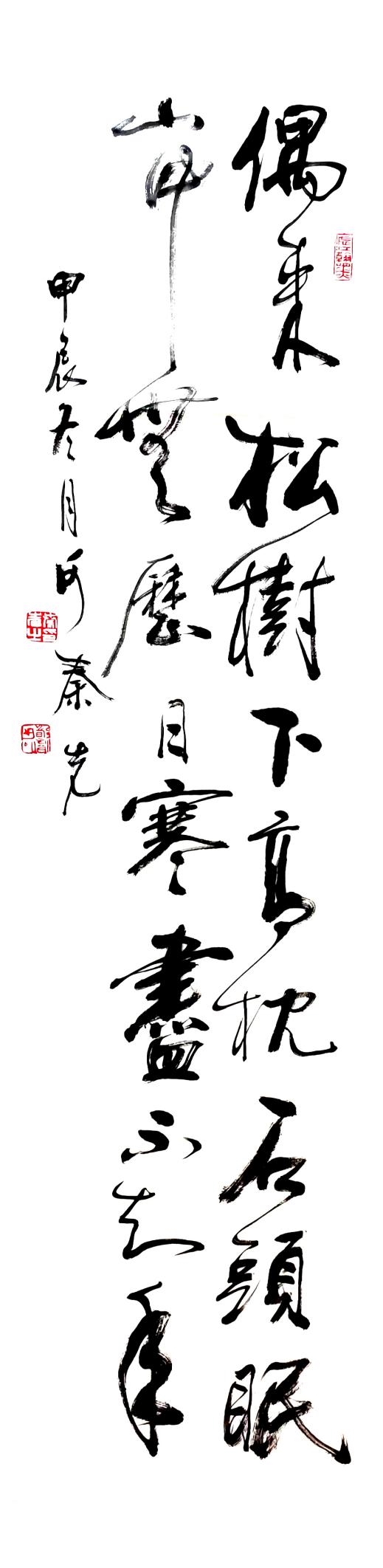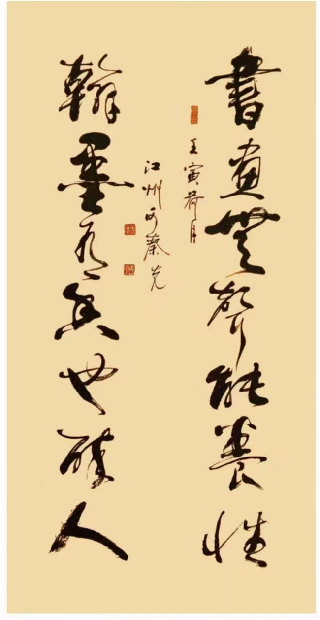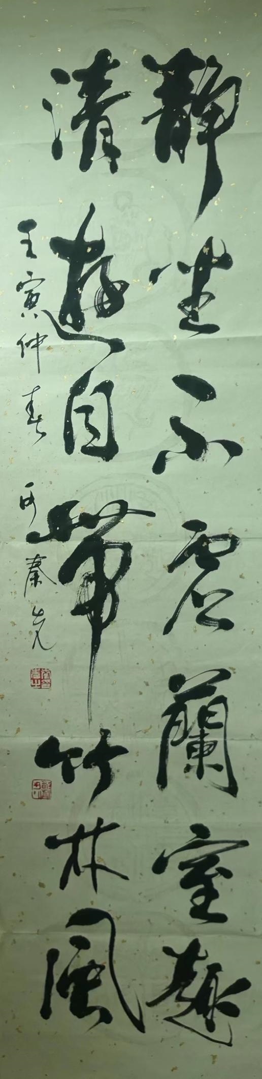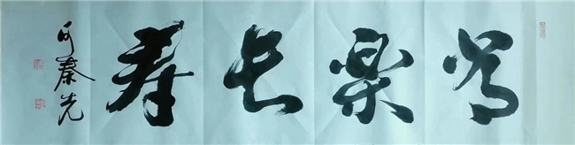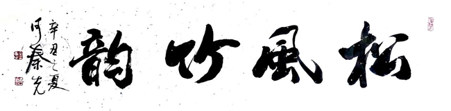 曾临习过一些金文、碑文和历代名家名帖,尤善行、草及榜书。创作时注重线条的空间造型,将雄强与柔美有机融合。