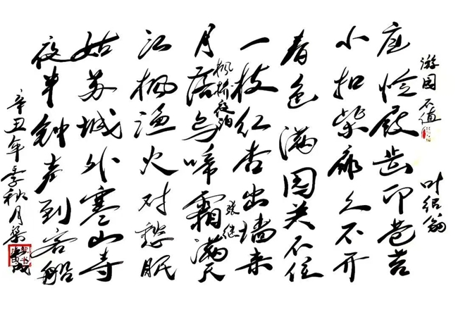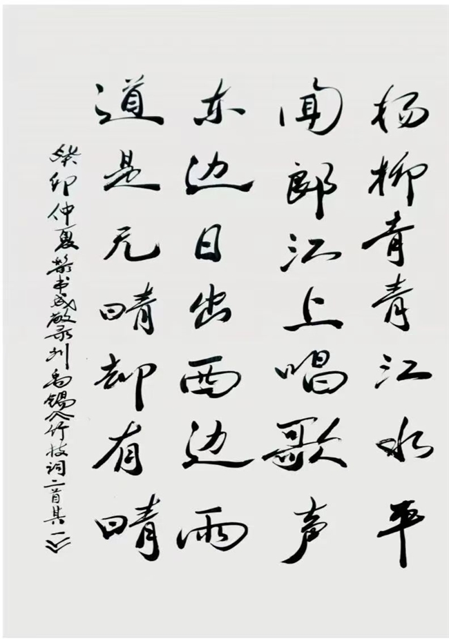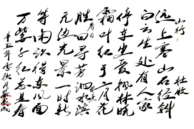 从书法的创作角度上来看,笔墨功底和文人修养这两类基础是谓缺一不可,并且书法家自身的思想和情感越是丰富,其所在作品中表现出的书风气象也就会愈加透彻!正如常言所道,书如其人也。而今日黎书成先生的书法造诣便也就是 有深植于此德艺双馨的创作正道!对黎书成先生而言,书法的创作必然是要裹挟者其自身的情感寄托,唯有如此,方才能使笔墨达到一种寄妙理于豪放之内的表现境地!线条章法,皆为所动,功底扎实,从心所欲!名家书法和常人书法的不同之处,就是在于其间的匠俗意味,常人书家以技为高,而名家作品则多是尚意为本。