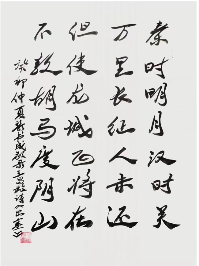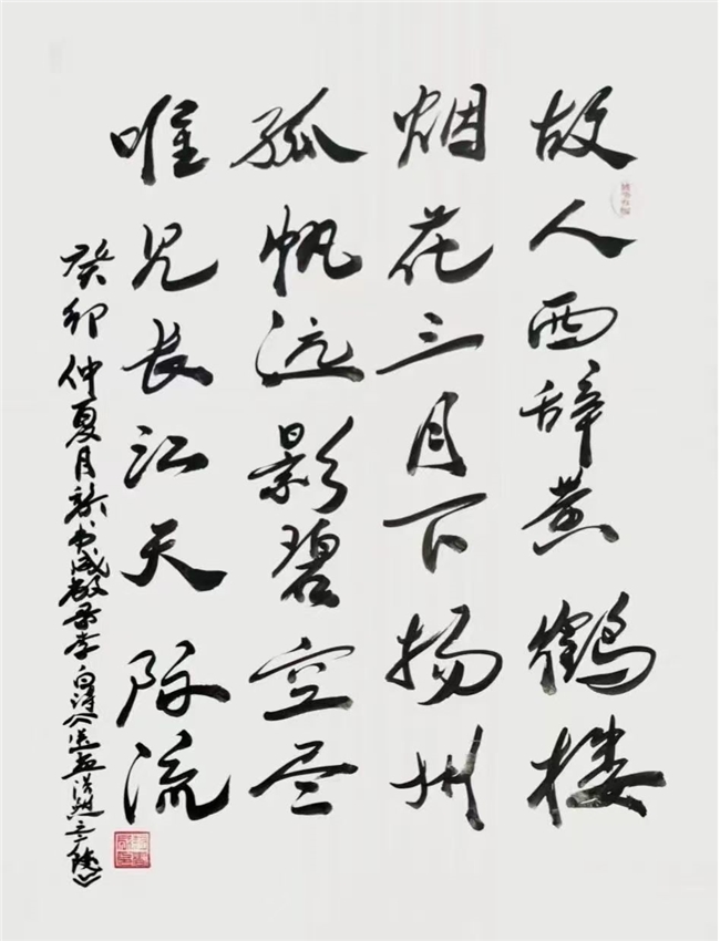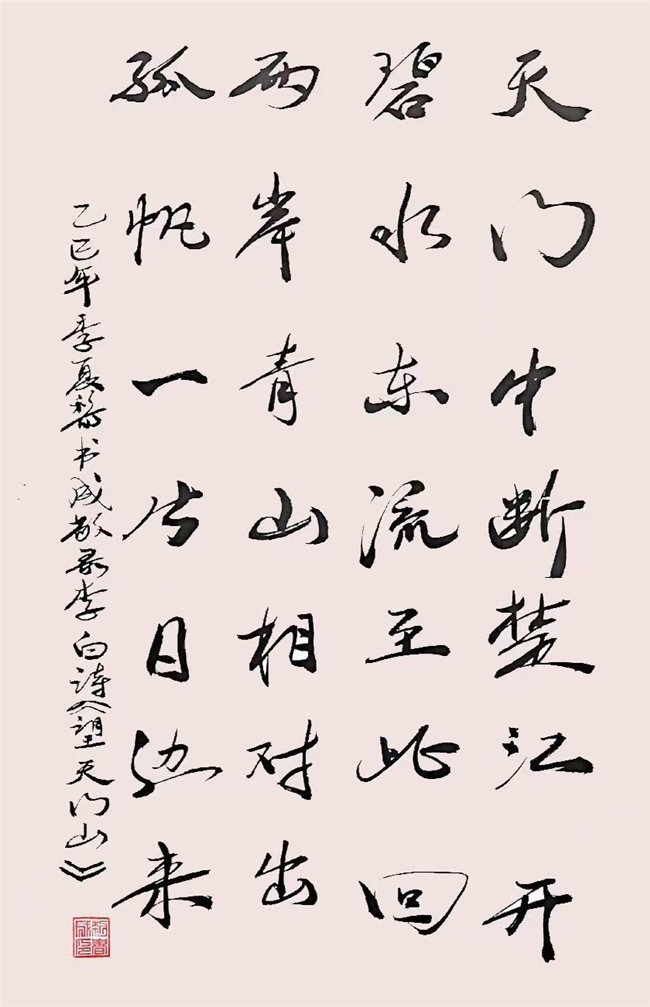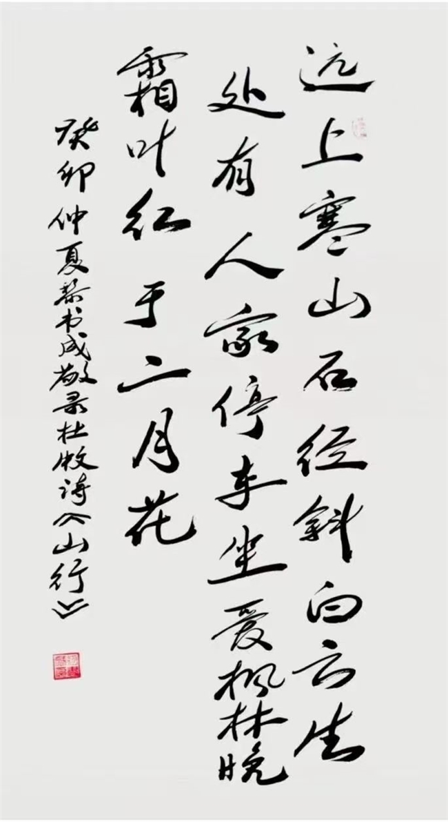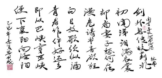 行书作品以古典诗词为题,如此书写间自是有其豪迈性情为动力,用笔慷锵有力,恰是力透纸背,笔墨张弛中更是 极具节奏质感,诗文情绪高涨时,笔墨则为之激情扬溢,诗文抒情高雅时,笔墨则亦是为之流畅凝练,臂如在黎书成先生的一幅《望庐山瀑布》书法作品中,行书用笔即是圆转自 如,墨迹行至忽重忽轻,以至所到之处别具一格,浓时好似屋漏痕,淡时好似锥画沙,字字笔线,由此皆是能在一点之内殊衄挫于豪芒,一画之间变起伏于锋杪!撼人心神,荡气回肠!逸笔作书于奇绝,翰墨超群自非凡。