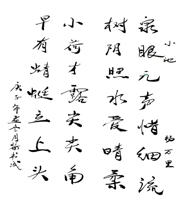 今黎书成先生之所以能在当下书坛内树立翰墨高品,很 大原因也就是在于他那逸笔而为的尚意之风!其书作于行体,既有胎息二王之根基,又有汲取米芾之真意,如此书之众幅,皆是可见一股不激不厉但又流畅洒脱的盎然之美!而这种书风表现,显然也就是有别于当下众多只会生硬搬照的匠俗之作,是有可赏可会之处,更有可品可鉴之感,大家书风,一目了然!