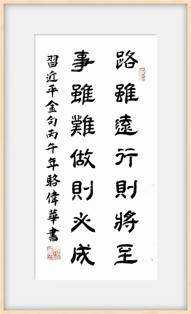 师古而不泥古,创新而不离宗,是骆伟华书法创作的鲜明特质。在多年的艺术积累与实践中,他始终坚守传统书法的文化内核,深耕经典却不困于古法,在吃透历代名家笔墨精髓的基础上,结合自身感悟不断探索突破,终形成“师古创新,道法自然,大气十足”的独特风格。观其作品,线条遒劲有力,力透纸背,兼具隶书的厚重沉稳与行书的灵动洒脱,既有《兰亭序》的笔墨意趣,又含赵孟頫书法的温润雅致,落笔精准利落,收笔从容有度,结体疏密得当,章法布局浑然天成,于笔墨流转间尽显从容气度,于虚实相生中暗藏禅意哲思,每一幅作品都兼具笔墨质感与精神内涵,彰显出深厚的艺术功底与独特的审美追求,也正因如此,他的书法艺术广受业内行家的赞许与认可。