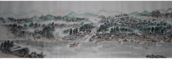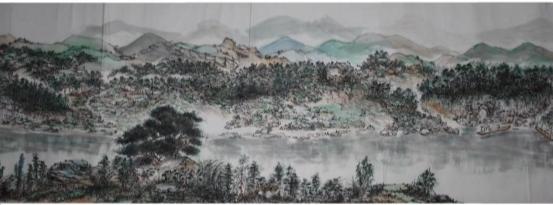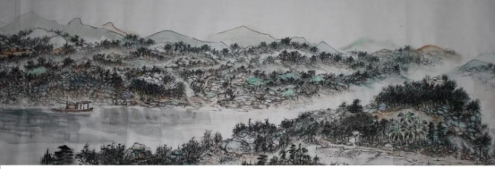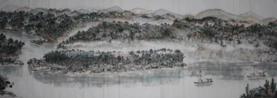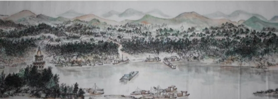 二、历年来本人一直采用国画艺术手段表现富有时代气势的城市变迁图---永州。这是一座历史名城,座落在江南的潇湘河畔源河两岸,景色非常优美。如此它也经历了三个时期的突岀变化,如此称谓“永州潇湘三步曲系列”。三步曲分别为《永州河西大观图》长6米、宽40厘米,表现改革开放初期。《锦绣潇湘》长16米、宽40厘米,表现解放初期。《潇湘宏图》描绘现今时期,其城市变化巨大,目前已描绘了10米多、才完成三分之一段,这是我毕生所投入的,用传统绘画艺术说话,因此所创作的也都是长卷等。