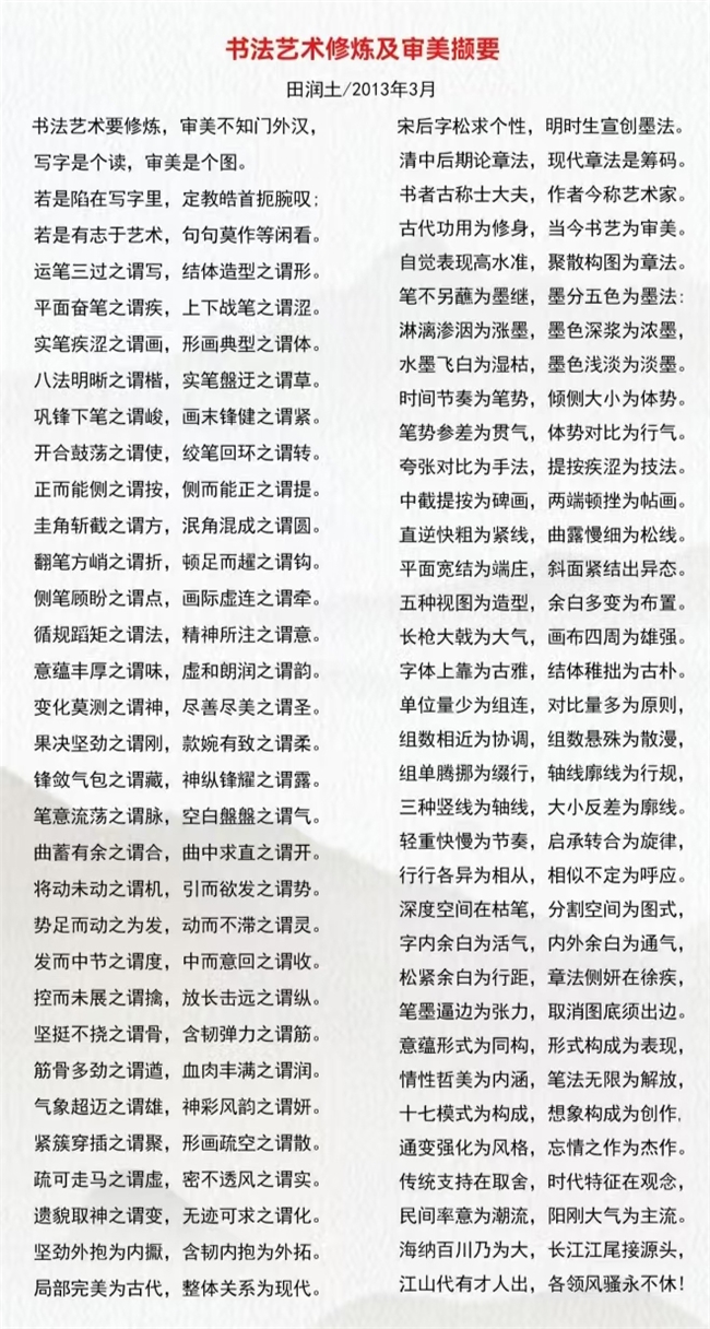 田润土书法讲究字法、笔法、章法。字法:聚点画而成字,“平衡对称,对比和谐,主次得宜,疏密适度,多样统一。”笔法:因体而变,稳实丰富,法出有源,笔力遒劲、力透纸背。章法:字与字,行与行之间笔势连绵,节奏分明,如“行云流水”,即所谓“疏处可以走马,密处不使透风。”