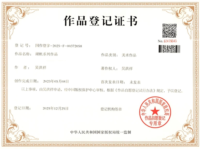 近日,著名艺术家吴洪祥创作的“湖帆系列作品”经中国版权保护中心严格审核,成功完成著作权登记,登记号为“国作登字-2025-F-00372058”,登记证书由中华...