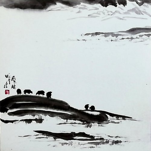 补题:时至严冬白茫茫,放眼旷野皆陈荒,生灵畏寒多隐避,唯有野牛戏冰霜。