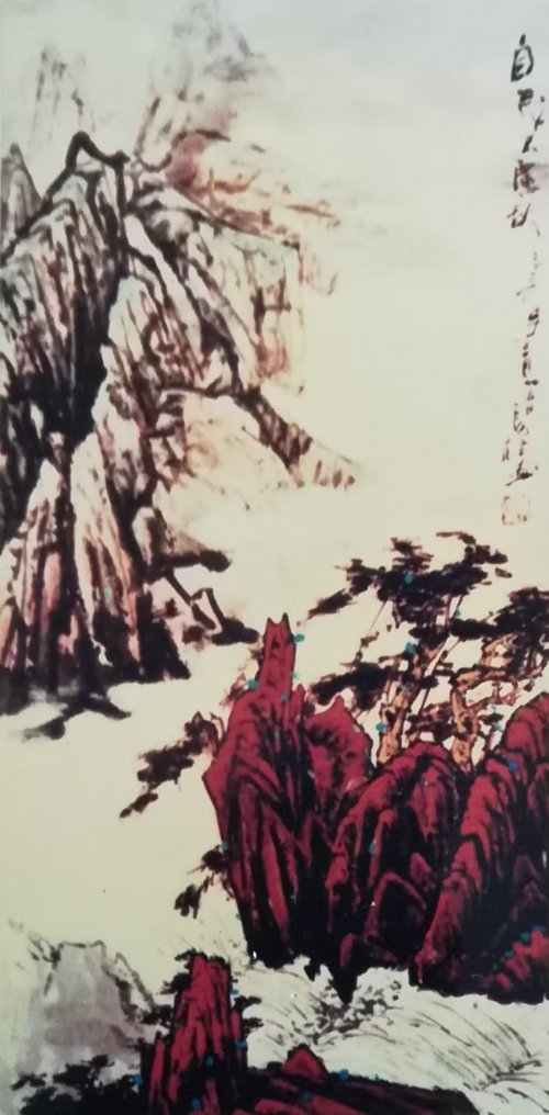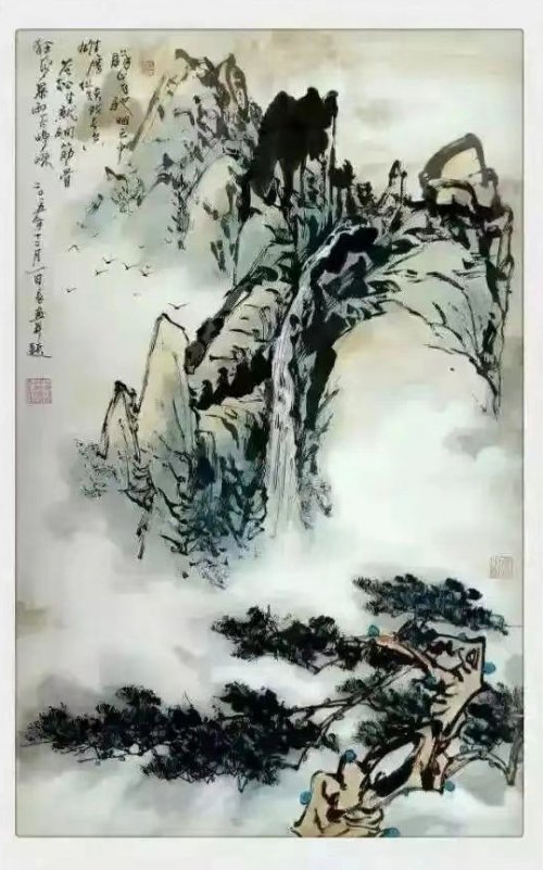 补题:云绣险峰势苍茫,朝朝映霞披红光,虬松摇曳戏风劲,溪流曲折奔大洋。