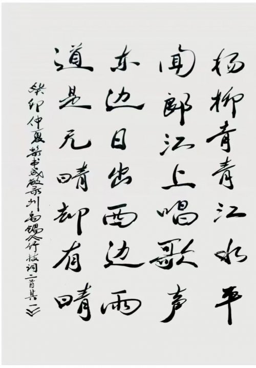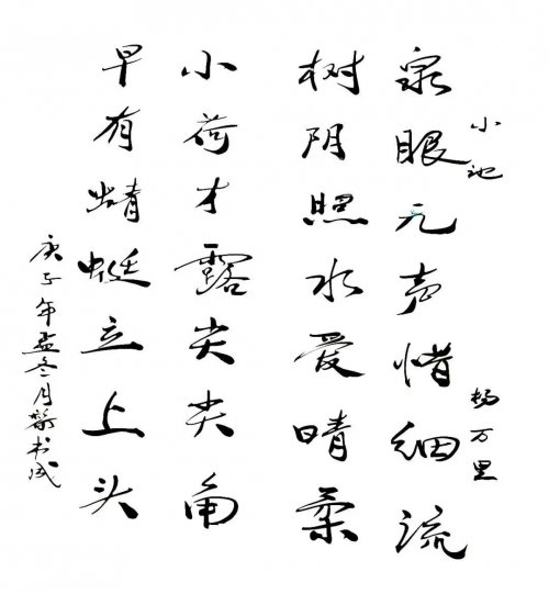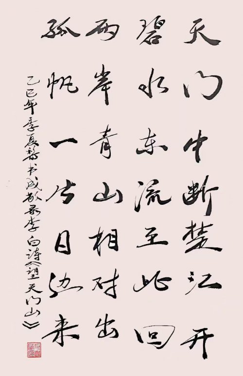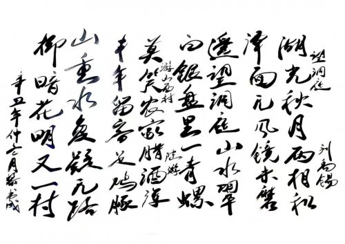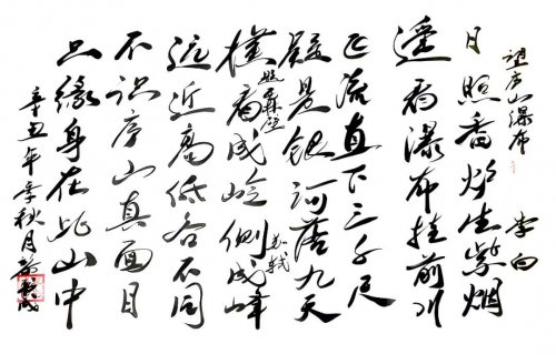 今黎书成先生之所以能在当下书坛内树立翰墨高品,很 大原因也就是在于他那逸笔而为的尚意之风!其书作于行体,既有胎息二王之根基,又有汲取米芾之真意,如此书之众幅,皆是可见一股不激不厉但又流畅洒脱的盎然之美!而这种书风表现,显然也就是有别于当下众多只会生硬搬照的匠俗之作,是有可赏可会之处,更有可品可鉴之感,大家书风,一目了然!行书作品以古典诗词为题,如此书写间自是有其豪迈性情为动力,用笔慷锵有力,恰是力透纸背,笔墨张弛中更是 极具节奏质感,诗文情绪高涨时,笔墨则为之激情扬溢,诗文抒情高雅时,笔墨则亦是为之流畅凝练,臂如在黎书成先生的一幅《望庐山瀑布》书法作品中,行书用笔即是圆转自 如,墨迹行至忽重忽轻,以至所到之处别具一格,浓时好似屋漏痕,淡时好似锥画沙,字字笔线,由此皆是能在一点之 内殊衄挫于豪芒,一画之间变起伏于锋杪!撼人心神,荡气回肠!逸笔作书于奇绝,翰墨超群自非凡。