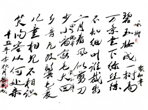 从书法的创作角度上来看,笔墨功底和文人修养这两类基础是谓缺一不可,并且书法家自身的思想和情感越是丰富,其所在作品中表现出的书风气象也就会愈加透彻!正如常言所道,书如其人也。而今日黎书成先生的书法造诣便也就是 有深植于此德艺双馨的创作正道!对黎书成先生而言,书法的创作必然是要裹挟者其自身的情感寄托,唯有如此,方才 能使笔墨达到一种寄妙理于豪放之内的表现境地!线条章法,皆为所动,功底扎实,从心所欲!名家书法和常人书法的不同之处,就是在于其间的匠俗意味,常人书家以技为高,而名家作品则多是尚意为本。